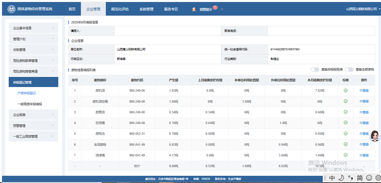 2025年9月山西高义钢铁有限公司危险废物产生情况公开信息