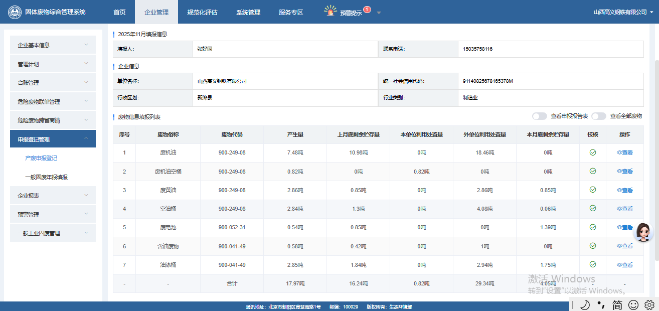2025年11月山西高义钢铁有限公司危险废物产生情况公开信息